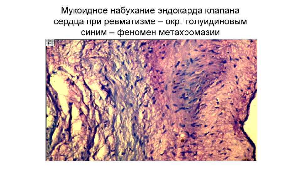Сохранная поперечная исчерченность коллагеновых ФИБРИЛЛ Промежутки между коллагеновыми ФИБРИЛЛАМИ расширены Мукоидное набухание в соединительной ткани створки митрального клапана при ревматизме. Слева – трансмиссионная электронная микроскопия, справа – световая микроскопия (окр. толуидиновым синим) О высвобождении ГАГ свидетельствуют участки метахромазии стромы