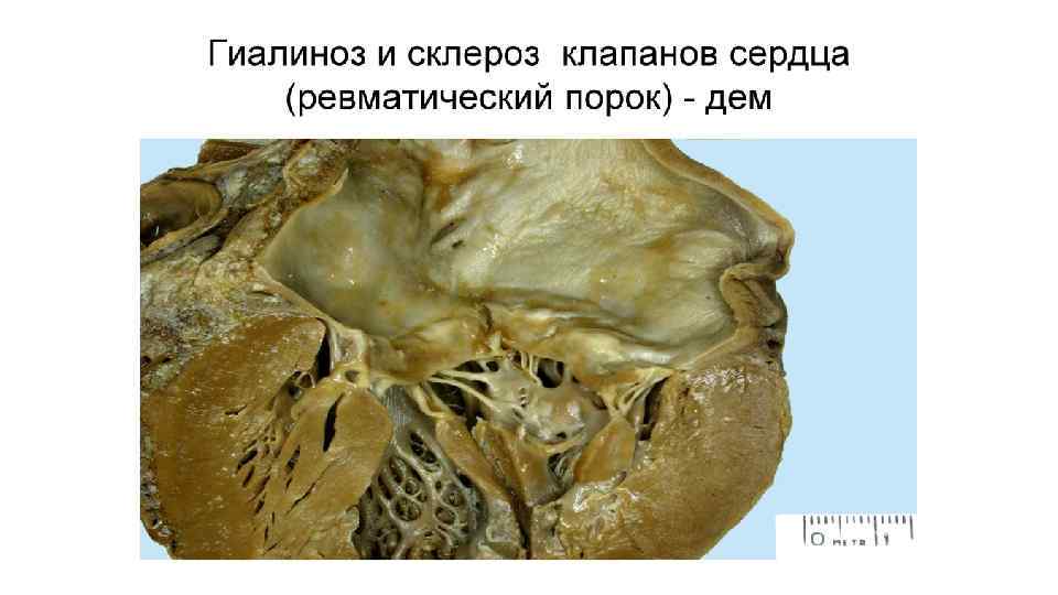Вид дистрофии Классификация стромально-сосудистых белковых дистрофий Характеристика Примеры Мукоидное набухание Результат деструкции коллагеновых волокон с распадом на коллагеновые фибриллы (с сохранной поперечной исчерченностью обратимость изменений) и высвобождением гликозаминогликанов (ГАГ) (возникает феномен метахромазии, уменьшается сцепление между фибриллами, что увеличивает расстояние между ними). • Мукоидное набухание в створках митрального клапана при ревматических болезнях (иммуннокомплексное поражение) • Наследственные нарушения структуры соединительной ткани (синдромы дисплазии соединительной ткани) Фибриноидное набухание Как правило, следствие мукоидного набухания. Отличается распадом коллагеновых фибрилл (потеря поперечной исчерченности необратимо) и инфильтрацией ткани фибриногеном из плазмы крови за счет резкого повышения сосудистой проницаемости. В результате образуется фибриноид. В дальнейшем может быть фибриноидный некроз. Фибриноидное набухание/некроз: • Сосудов и соединительной ткани при иммунокомплексных поражениях • Артериол при гипертоническом кризе (некроз стенки с пропитыванием фибриногеном из плазмы) • Сосудов в дне хронических язв (некроз стенки с пропитыванием фибриногеном из плазмы) • Отложение фибриноида В НОРМЕ в стенках спиральных артерий при имплантации плодного яйца Гиалиноз Заключительная стадия предыдущих изменений, плазматического пропитывания, воспаления, некроза, склероза. Соединительная ткань или стенка сосуда замещается однородными розовыми массами (похожи на гиалиновый хрящ при окраске гем. эоз. ), не разрушающимися ферментами. Нарушается транспорт веществ, уплотняется консистенция, снижается эластичность, прозрачность ткани (например, створок клапана). N. B. Гиалиново-капельная дистрофия и гиалиноз относятся к т. н. «гиалиновым изменениям» , несмотря на различия в локализации и механизмах. 3 вида сосудистого гиалина: • простой (результат хронического плазматического пропитывания) – артериолы и клубочки при артериальной гипертензии • сложный (содержит иммунные комплексы) –сосуды и клубочки при длительном поражении иммунными комплексами (например, СКВ) • липогиалин (содержил липиды) – артериолы и клубочки при сахарном диабете Гиалиноз клапанов при ревматических пороках (исход мукоидного и фибриноидного набуханий) Амилоидоз Самостоятельный вид дистрофии. Характеризуется образованием фибриллярных нерастворимых белков из растворимых белковпредшественников при нарушении фолдинга. Изучается в теме «иммунная патология»