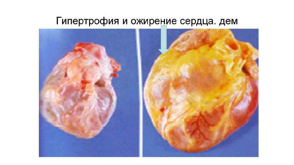 Жировая дистрофия миокарда, «тигровое сердце» Причина характерного отложения липидов – наиболее выраженная гипоксия в данных участках: • Как правило, левый желудочек (наибольшая толщина, наибольшая потребность в кислороде) • Под эндокардом (в норме прозрачен) области трабекул и сосочковых мышц (наиболее удалены от устья коронарных артерий) • В виде полос (по ходу мелких вен) Микроскопически – как правило, пылевидная и мелкокапельная жировая дистрофия, разрушение цитоскелета, саркомеров (электронная микроскопия) Макроскопически: Увеличение размеров (и массы), закругление верхушки (дилатация всех полостей) за счет приобретения дряблой консистенции миокарда (разрушение цитоскелета) • Глинистый вид миокарда (отложение липидов). Клинически – сердечная недостаточность (разрушение саркомеров) •