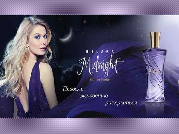 Парфюмерная вода Belara Midnigh ™ цветочно - фруктовый аромат Девиз аромата «Раскрой тайну мгновения» Верхние ноты: розовый перец, экзотические фрукты и дикие ягоды. Средние ноты: пурпурный пион, египетский жасмин, семена черной ванили. Нижние ноты: сандаловое дерево, амбра, бархатный мускус. Интригующая, женственная, опьяняющая своей красотой Год создания – 2013 Парфюмерный дом «Givaudan» (Живодан) (Швейцария) Создатель – Винсент Кузински "Этот аромат энергичный, экзотический и в то же время легкий, словно маленькое черное платье. . . Прекрасный, притягательный аромат Belara Midnight завораживает и Победитель парфюмерной влюбляет в себя также легко, как и женщина, которая его выбирает. . . " - так описал премии Fi. Fi® RUSSIAN свой аромат Винсент Кузински. FRAGRANCE AWARDS 2013 в номинации Life Style. В Пленительный, страстный, загадочный, этот запах пробуждает августе 2014 года воображение и открывает самые потаенные грани женского очарования и Парфюмерная вода Belara чувственности. Осмельтесь стать волшебной женщиной. Магнетические Midnight™ была отмечена свойства аромата помогают улучшить настроение. Пробудить самые редакцией глянцевого сокровенные тайные чувства и превратить реальность в таинственную журнала Allure и стала романтическую сказку. номинантом на премию Best Парфюм покоряет разум и сердце также как и женщина, которая его носит. of Beauty! Премия вручается лучшим косметическим Дизайн флакона имеет элегантную форму и окрашен фиолетово - голубой цвет. средствам года по мнению Фиолетовый - символизирует сильные черты характера, а бирюзовый чистоту и читателей сайтаwww. allure. ru женственность. Плавно перетекающие цвета говорят о сбалансированности этого образа и его гармонии. Идея и разработка: Анастасия Ковалевская, Арина Кузнецова, Светлана Хорошавина, Татьяна Дроздович, Юлия Архипова 50 мл