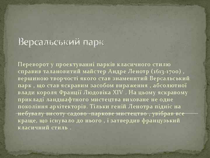 Версальський парк Переворот у проектуванні парків класичного стилю справив талановитий майстер Андре Ленотр (1613 -1700) , вершиною творчості якого став знаменитий Версальський парк , що став яскравим засобом вираження , абсолютної влади короля Франції Людовіка XIV. На цьому яскравому прикладі ландшафтного мистецтва виховане не одне покоління архітекторів. Тільки геній Ленотра підніс на небувалу висоту садово -паркове мистецтво , увібрав все краще, що існувало до нього , і затвердив французький класичний стиль.