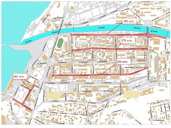Создание прибордюрных парковок В настоящее время определен перечень прибордюрных парковок в Центральном и Адлерском внутригородских районах города Сочи: • ул. Конституции СССР, Центральный район, г. Сочи – 192 м/м • ул. Островского, Центральный район, г. Сочи – 170 м/м • ул. Роз, Центральный район, г. Сочи – 192 м/м • ул. Войкова, ул. Кооперативная, Центральный район, г. Сочи – 101 м/м • Закрытая парковка «Морской порт» , ул. Войкова 1, Центральный район, г. Сочи – 150 м/м • ул. Кирова, Адлерский район, г. Сочи – 121 м/м • ул. Демократическая, Адлерский район, г. Сочи – 121 м/м • ул. Ленина, Центральный район, г. Сочи – 56 м/м