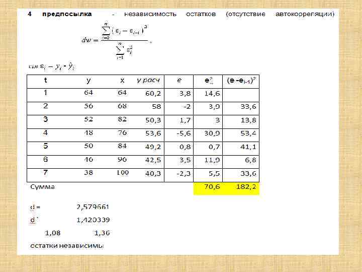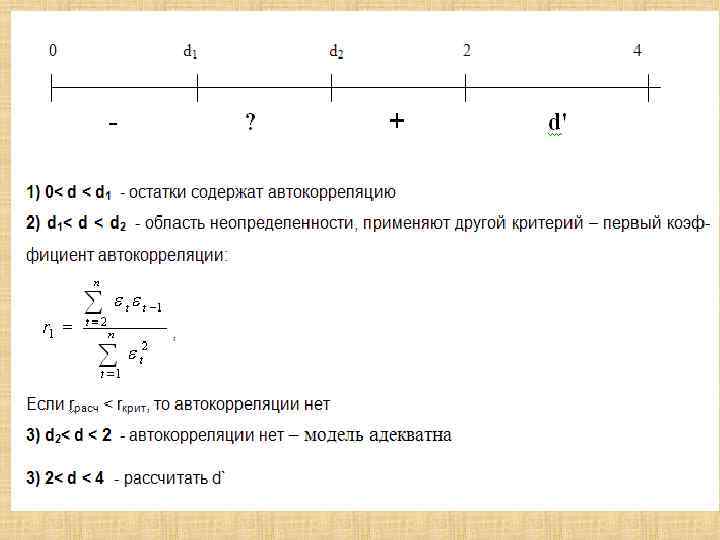 Проверка выполнения предпосылок МНК 1. условие равенства нулю математического ожидания остатков 2. нормальное распределение остатков 3. гомоскедастичность остатков 4. независимость остатков (отсутствие автокорреляции)