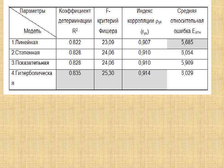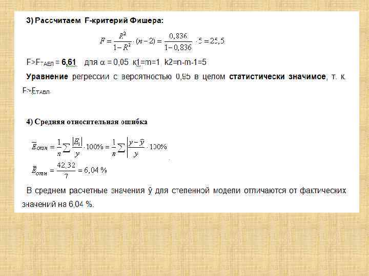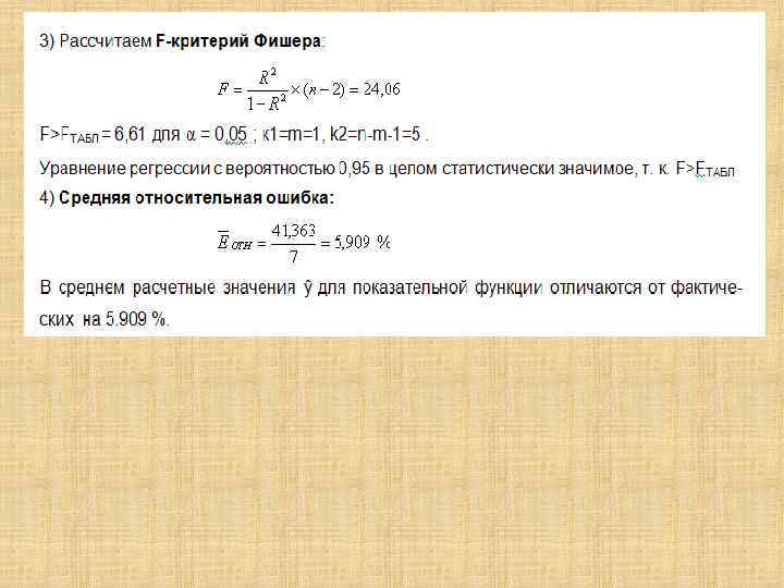 Оценка значимости модели парной регрессии Расчетное значение критерия Фишера: Критическое (табличное) значение критерия Фишера определяется по таблице с учетом: 1= k , 2 = (n - k - 1) – число степеней свободы α – уровень значимости Если F расч. > F табл. – модель значима
