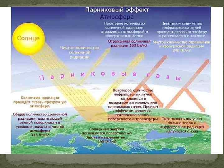 Причины К причинам, вызывающим обострение парникового эффекта в атмосфере, относят: - хозяйственную деятельность, которая меняет газовый состав и вызывает запыленность нижних воздушных слоев Земли; - сжигание углеродосодержащих видов топлива, уголь, нефть и газ; - выхлопные газы автомобильных двигателей; - функционирование теплоэлектростанций; - сельское хозяйство, связанное с излишним гниением и переизбытком удобрений, значительным приростом поголовья скота; - добычу природных ископаемых; - выброс отходов быта и промышленных производств; - вырубку лесов. Удивительно, но факт, что воздух уже перестал быть возобновляемым природным ресурсом, каковым оставался до начала интенсивной человеческой деятельности.