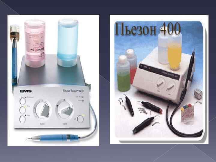 Ультрадыбыстық терапия Емдік факторы: ультрадыбыс - адамның есту қабілетімен қабылданбайтын диапазонда жиілігі 20 к. Гц-тен жоғары серпімді орта бөлшектерінің механикалық тербелістері. Терапиялық тиімділігі: қабынуға қарсы әсер ету, сезімталдықты азайтушы, ауыруды бәсеңдетуші, спазмолитикалық, фибролитикалық, ісікті жоятын әсері, жергілікті қан және лимфа айналымын белсенділендіру, алмасу процестерін реттеу, нерв және эндокринді жүйелердің функционалды жағдайын қалыптастыру, қалпына келу процесін жеделдету. Көрсеткіштері: созылмалы катаральды гингивит, гипертрофиялық гингивит, пародонтит. Қарсы көрсеткіштері: қанағыштыққа бейімділіктің болуы, қатерлі ісіктер, қатты жүдеу, жедел инфекциялық аурулар, диабеттің ауыр түрлері, тромбофлебит, жедел қабыну және асқынулары жиі байқалатын созылмалы қабыну процестері. Аппаратурасы: УЗТ-102 С, УЗТ-3, 04 С, «Ультрадыбыс Т-5» . Мөлшерлемесі: үздіксіз режимде жиілігі 800 к. Гц-тен 3 МГц-ке дейін; 0, 005 -тен 0, 4 Вт/см 2 дейін 3 -9 минут бойы сәуле шығару қарқындылығы, күнара 10 -12 процедура. Пародонтологияда ультрафонофорез (фонофорез) – тіндерге ультра-дыбыстың көмегімен дәрілік заттарды енгізу қолданылады. Пародонт ауруларын емдеуде дірілдеткішпен альвеолярлы өсіндінің кілегей қабығына түйісу ортасын - глицерин жағады, фонофорезде - гливенолдың майлы ерітіндісі, лидаза, 1% гепарин сықпасы, 5 % бутадион сықпасы, дибунолдың 10% линименті, видехол, С витамині, Е витамині, В тобының витаминдері жағылады. Импульсті бағытта қызыл иектің бетін сырғыта отырып, жылжымалы әдістемені шиыршық тәрізді қимылдату түрінде қолданады. Әсер ету мерзімі - әр жақ сүйегіне 5 мин. ; емдеу курсы – күнара 10 -12 емдеу шарасынан жүргізіледі. Ультрадыбыс тіс шөгінділерін алу үшін кеңінен қолданылады ( «Ультрастом» , «Ультрадент» , «Пьезон Мастер» , «Мини Пьезон» , «Кавитон» аппараттары). Ультрадыбысты тербелістер ұштық пен су арқылы тіс тасына беріліп, оны бұзады. Ауытқымалы ұштықты шаятын су ағынында кавитация пайда болады. Әдіс тіс шөгінділерін ауыршаң сезімсіз, қанағыштықты болдырмай, тез алуға мүмкіндік береді. Ультрадыбысты өңдеуден кейін, тістердің беттерін қосымша жылтырату талап етілмейді, бұл шөгінділердің қайта пайда болуының алдын алуға ықпалын тигізеді. Әсіресе, кавитацияның тиімділігі мен дәрілік препараттар ерітінділерімен (хлоргексидин, фурациллин және т. б. ) шаюды үйлестіру тиімділік көрсетеді.