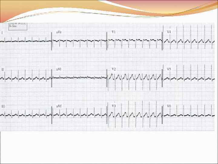 ЖЕЛУДОЧКОВАЯ ТАХИКАРДИЯ Пароксизмальная ЖТ: ≥ 3 желудочковых сокращений с ЧСС>120/мин (устойчивая длительность>30 сек). • зубцы Р не видны, зубцы Т четко не дифференцируются; • комплекс QRS ритмичный, деформирован (полиморфный, как при ЖЭС или блокаде ножки пучка Гиса) и расширен; • ЧСС>120/мин (меньшая частота обозначается как ускоренный идиовентрикулярный ритм); • ось отклонена влево; • одинаковая форма желудочковых комплексов;