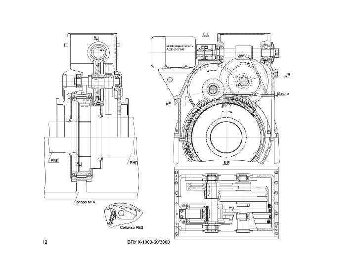 К-1000 -60/3000 Турбина представляет собой одновальный пятицилиндровый агрегат, состоящий из симметричного двухпоточного ЦВД и четырех симметричных двухпоточных ЦНД. Порядок отсчета ЦНД производится от регулятора скорости к генератору. Длина турбины - 50 м, всего турбоагрегата - 74 м. Турбоустановка К-1000 -60/3000 имеет дроссельное парораспределение. На турбине установлены четыре одинаковых блока парораспределения высокого давления (БПВД) и четыре одинаковых блока парораспределения низкого давления (БПНД). Стопорный и регулирующий клапан блока парораспределения низкого давления конструктивно похожи, имеют вид поворотных заслонок и расположены в одном корпусе. Работа регулирующих клапанов ЦНД отличается от работы регулирующих клапанов ЦВД: клапаны ЦНД регулируют расход пара через ЦНД только до нагрузки 30%.
