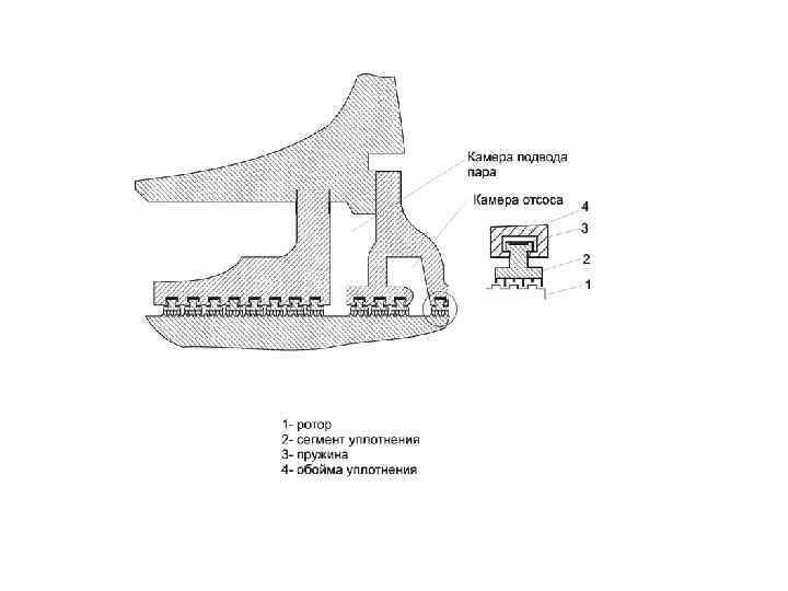Сепарация приводит к: Ø уменьшению эрозии вращающихся лопаток и неподвижных деталей; Ø снижению динамического заброса частоты вращения ротора при сбросе нагрузки и испарении пленок жидкости с поверхностей элементов турбины; Ø повышению экономичности ступеней. Организация внутритурбинной сепарации влаги Значительная часть влаги отбрасывается к корпусу по поверхности лопаток рабочего колеса. Сепарационные устройства располагают непосредственно за рабочим колесом. срез части бандажа Система ловушек для влаги: входная щель + полость камера регенеративного отбора Эффективность Унос влаги…