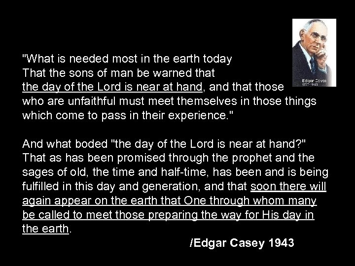 "What is needed most in the earth today That the sons of man be warned that the day of the Lord is near at hand, and that those who are unfaithful must meet themselves in those things which come to pass in their experience. " And what boded "the day of the Lord is near at hand? " That as has been promised through the prophet and the sages of old, the time and half-time, has been and is being fulfilled in this day and generation, and that soon there will again appear on the earth that One through whom many be called to meet those preparing the way for His day in the earth. /Edgar Casey 1943