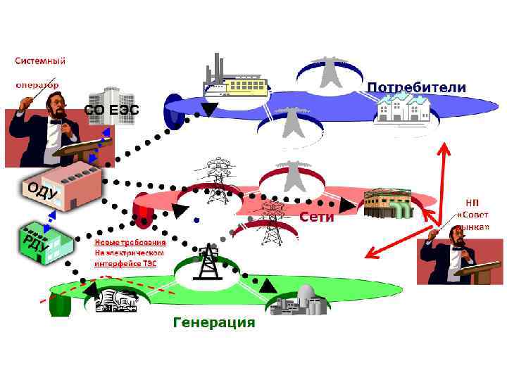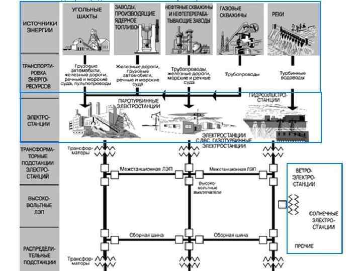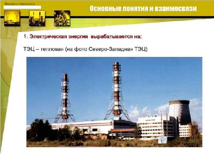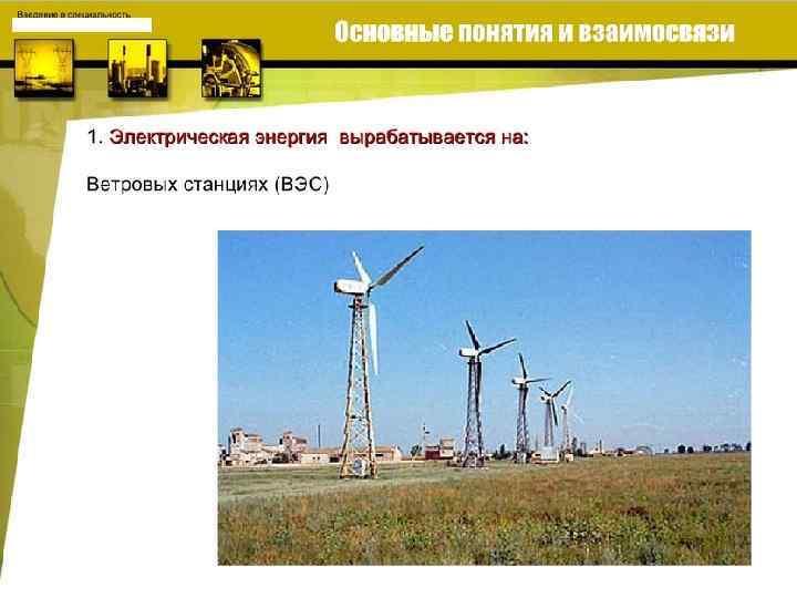 Типы электростанций • Тепловые (ТЭС), которые делятся на теплоэлетроцентрали - ТЭЦ, конденсационные – КЭС (крупные КЭС исторически получили название государственных районных электростанций - ГРЭС); • Атомные электростанции (АЭС); • Гидроэлектростанции (ГЭС) и гидроаккумулирующие электростанции (ГАЭС); • Дизельные электростанции (ДЭС); • Солнечные электростанции (СЭС); • Геотермальные электростанции (Гео. ТЭС); • Приливные электростанции (ПЭС); • Ветроэлектростанции (ВЭ);