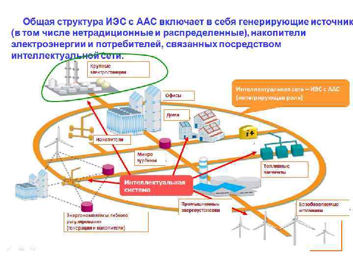 Умные сети в России Первичные задачи • Преодоление пиковых нагрузок в сетях (снятие ограничений на потребление, увеличение продажи). • Включение в сеть нерегулируемой Системным Оператором генерации ВИЭ (снижение вреда экологии). Наши ошибки • Решение задачи поручено ФСК, которая управляет магистральными сетями, а там сильно не поуправляешь. Наибольший эффект в распределительных сетях, но нужны миллионы интеллектуальных приборов. • Решение поручено государственной компании как НИОКР. Выход – бумага. На западе фирмы (Сименс, Арева, АББ) просто покупают новые стартапы и получают готовое к внедрению решение.