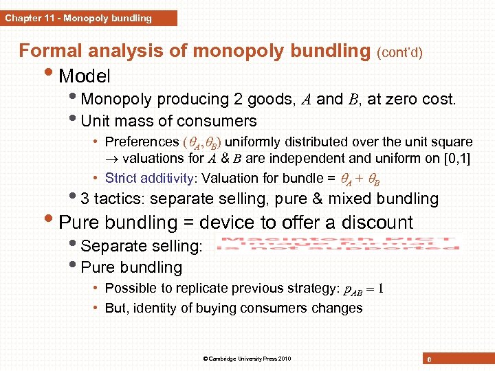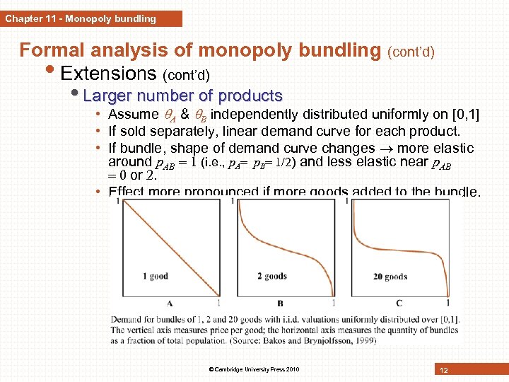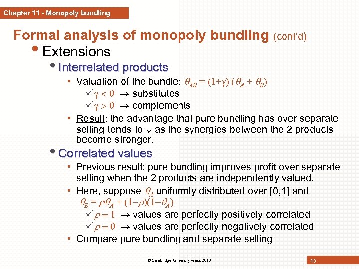 Chapter 11 - Monopoly bundling Formal analysis of monopoly bundling • Mixed bundling (cont’d) • Firm sells bundle (at p. AB) + A & B separately (at p. A, p. B) • Demands when p. A = p. B = p • Optimum: • Lesson: Mixed bundling allows the monopolist to increase its profits even further than pure bundling. Here, bundle is more expensive than under pure bundling and individual components are more expensive than under separate selling. © Cambridge University Press 2010 9