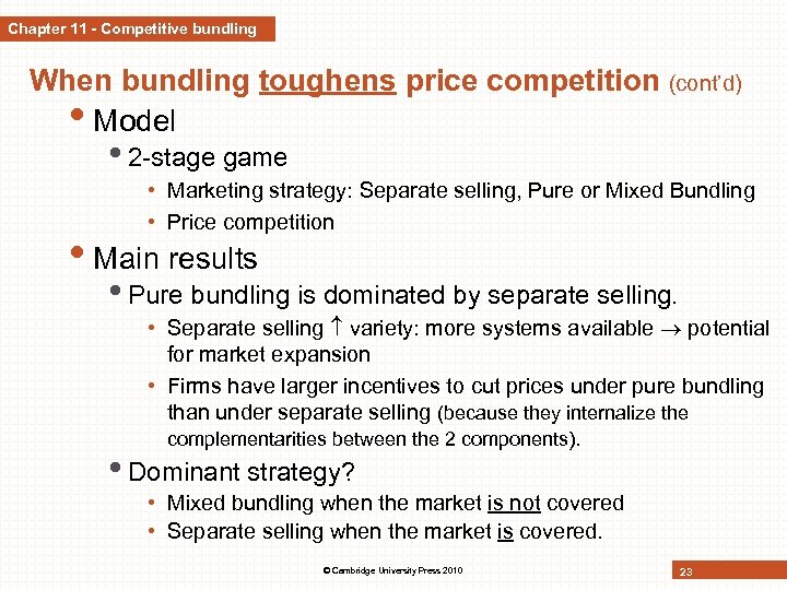 Chapter 11 - Competitive bundling When bundling toughens price competition (cont’d) • Model • 2 -stage game • Marketing strategy: Separate selling, Pure or Mixed Bundling • Price competition • Main results • Pure bundling is dominated by separate selling. • Separate selling variety: more systems available potential for market expansion • Firms have larger incentives to cut prices under pure bundling than under separate selling (because they internalize the complementarities between the 2 components). • Dominant strategy? • Mixed bundling when the market is not covered • Separate selling when the market is covered. © Cambridge University Press 2010 23