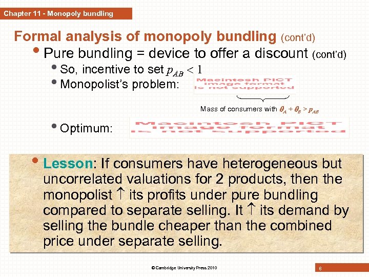 Chapter 11 - Monopoly bundling Formal analysis of monopoly bundling (cont’d) • Pure bundling = device to offer a discount (cont’d) • More marginal consumers more incentives to bundle price than to separate prices © Cambridge University Press 2010 7