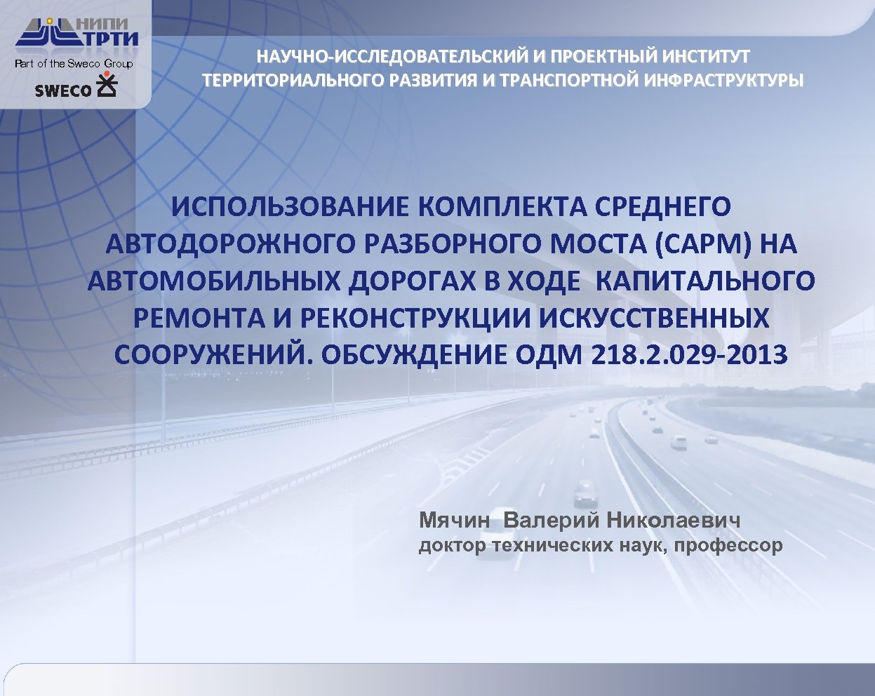 Part of the Sweco Group НАУЧНО-ИССЛЕДОВАТЕЛЬСКИЙ И ПРОЕКТНЫЙ ИНСТИТУТ ТЕРРИТОРИАЛЬНОГО РАЗВИТИЯ И ТРАНСПОРТНОЙ ИНФРАСТРУКТУРЫ ИСПОЛЬЗОВАНИЕ КОМПЛЕКТА СРЕДНЕГО АВТОДОРОЖНОГО РАЗБОРНОГО МОСТА (САРМ) НА АВТОМОБИЛЬНЫХ ДОРОГАХ В ХОДЕ КАПИТАЛЬНОГО РЕМОНТА И РЕКОНСТРУКЦИИ ИСКУССТВЕННЫХ СООРУЖЕНИЙ. ОБСУЖДЕНИЕ ОДМ 218. 2. 029 -2013 Мячин Валерий Николаевич доктор технических наук, профессор