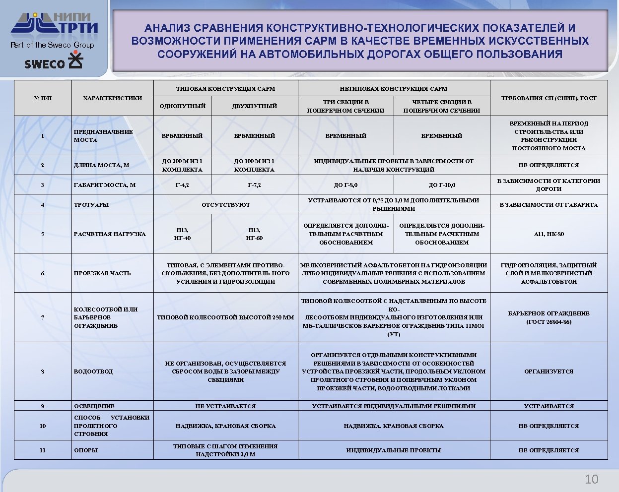 Part of the Sweco Group АНАЛИЗ СРАВНЕНИЯ КОНСТРУКТИВНО-ТЕХНОЛОГИЧЕСКИХ ПОКАЗАТЕЛЕЙ И ВОЗМОЖНОСТИ ПРИМЕНЕНИЯ САРМ В КАЧЕСТВЕ ВРЕМЕННЫХ ИСКУССТВЕННЫХ СООРУЖЕНИЙ НА АВТОМОБИЛЬНЫХ ДОРОГАХ ОБЩЕГО ПОЛЬЗОВАНИЯ ТИПОВАЯ КОНСТРУКЦИЯ САРМ № П/П ХАРАКТЕРИСТИКИ ОДНОПУТНЫЙ ДВУХПУТНЫЙ 1 ПРЕДНАЗНАЧЕНИЕ МОСТА ВРЕМЕННЫЙ 2 ДЛИНА МОСТА, М ДО 200 М ИЗ 1 КОМПЛЕКТА ДО 100 М ИЗ 1 КОМПЛЕКТА 3 ГАБАРИТ МОСТА, М Г-4, 2 Г-7, 2 4 ТРОТУАРЫ 5 6 7 РАСЧЕТНАЯ НАГРУЗКА ПРОЕЗЖАЯ ЧАСТЬ КОЛЕСООТБОЙ ИЛИ БАРЬЕРНОЕ ОГРАЖДЕНИЕ ОТСУТСТВУЮТ Н 13, НГ-40 Н 13, НГ-60 НЕТИПОВАЯ КОНСТРУКЦИЯ САРМ ТРИ СЕКЦИИ В ПОПЕРЕЧНОМ СЕЧЕНИИ ВРЕМЕННЫЙ ЧЕТЫРЕ СЕКЦИИ В ПОПЕРЕЧНОМ СЕЧЕНИИ ВРЕМЕННЫЙ ИНДИВИДУАЛЬНЫЕ ПРОЕКТЫ В ЗАВИСИМОСТИ ОТ НАЛИЧИЯ КОНСТРУКЦИЙ ДО Г-8, 0 ДО Г-10, 0 УСТРАИВАЮТСЯ ОТ 0, 75 ДО 1, 0 М ДОПОЛНИТЕЛЬНЫМИ РЕШЕНИЯМИ ОПРЕДЕЛЯЕТСЯ ДОПОЛНИТЕЛЬНЫМ РАСЧЕТНЫМ ОБОСНОВАНИЕМ ТРЕБОВАНИЯ СП (СНИП), ГОСТ ВРЕМЕННЫЙ НА ПЕРИОД СТРОИТЕЛЬСТВА ИЛИ РЕКОНСТРУКЦИИ ПОСТОЯННОГО МОСТА НЕ ОПРЕДЕЛЯЕТСЯ В ЗАВИСИМОСТИ ОТ КАТЕГОРИИ ДОРОГИ В ЗАВИСИМОСТИ ОТ ГАБАРИТА А 11, НК-80 ТИПОВАЯ, С ЭЛЕМЕНТАМИ ПРОТИВОСКОЛЬЖЕНИЯ, БЕЗ ДОПОЛНИТЕЛЬ-НОГО УСИЛЕНИЯ И ГИДРОИЗОЛЯЦИИ МЕЛКОЗЕРНИСТЫЙ АСФАЛЬТОБЕТОН НА ГИДРОИЗОЛЯЦИИ ЛИБО ИНДИВИДУАЛЬНЫЕ РЕШЕНИЯ С ИСПОЛЬЗОВАНИЕМ СОВРЕМЕННЫХ ПОЛИМЕРНЫХ МАТЕРИАЛОВ ГИДРОИЗОЛЯЦИЯ, ЗАЩИТНЫЙ СЛОЙ И МЕЛКОЗЕРНИСТЫЙ АСФАЛЬТОБЕТОН ТИПОВОЙ КОЛЕСООТБОЙ ВЫСОТОЙ 250 ММ ТИПОВОЙ КОЛЕСООТБОЙ С НАДСТАВЛЕННЫМ ПО ВЫСОТЕ КОЛЕСООТБОЕМ ИНДИВИДУАЛЬНОГО ИЗГОТОВЛЕНИЯ ИЛИ МЕ-ТАЛЛИЧЕСКОЕ БАРЬЕРНОЕ ОГРАЖДЕНИЕ ТИПА 11 МО 1 (УТ) БАРЬЕРНОЕ ОГРАЖДЕНИЕ (ГОСТ 26804 -86) ОРГАНИЗУЕТСЯ ОТДЕЛЬНЫМИ КОНСТРУКТИВНЫМИ РЕШЕНИЯМИ В ЗАВИСИМОСТИ ОТ ОСОБЕННОСТЕЙ УСТРОЙСТВА ПРОЕЗЖЕЙ ЧАСТИ, ПРОДОЛЬНЫМ УКЛОНОМ ПРОЛЕТНОГО СТРОЕНИЯ И ПОПЕРЕЧНЫМ УКЛОНОМ ПРОЕЗЖЕЙ ЧАСТИ, ВОДООТВОДНЫМИ ЛОТКАМИ ОРГАНИЗУЕТСЯ 8 ВОДООТВОД НЕ ОРГАНИЗОВАН, ОСУЩЕСТВЛЯЕТСЯ СБРОСОМ ВОДЫ В ЗАЗОРЫ МЕЖДУ СЕКЦИЯМИ 9 ОСВЕЩЕНИЕ НЕ УСТРАИВАЕТСЯ ИНДИВИДУАЛЬНЫМИ РЕШЕНИЯМИ УСТРАИВАЕТСЯ 10 СПОСОБ УСТАНОВКИ ПРОЛЕТНОГО СТРОЕНИЯ НАДВИЖКА, КРАНОВАЯ СБОРКА НЕ ОПРЕДЕЛЯЕТСЯ 11 ОПОРЫ ТИПОВЫЕ С ШАГОМ ИЗМЕНЕНИЯ НАДСТРОЙКИ 2, 0 М ИНДИВИДУАЛЬНЫЕ ПРОЕКТЫ НЕ ОПРЕДЕЛЯЕТСЯ 10