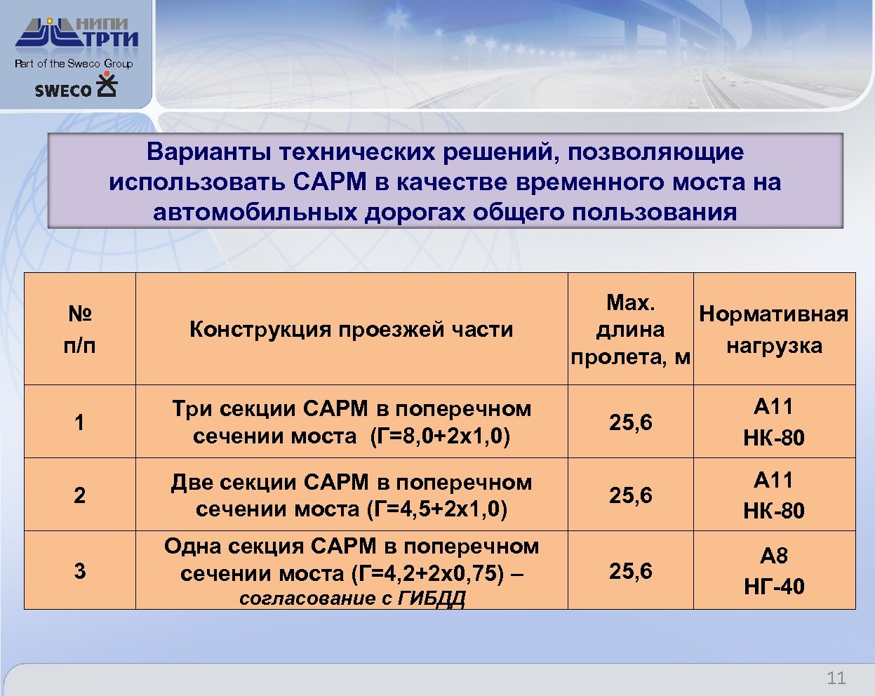Part of the Sweco Group Варианты технических решений, позволяющие использовать САРМ в качестве временного моста на автомобильных дорогах общего пользования № п/п Конструкция проезжей части 1 Три секции САРМ в поперечном сечении моста (Г=8, 0+2 х1, 0) 2 Две секции САРМ в поперечном сечении моста (Г=4, 5+2 х1, 0) 3 Одна секция САРМ в поперечном сечении моста (Г=4, 2+2 х0, 75) – согласование с ГИБДД Мах. Нормативная длина нагрузка пролета, м 25, 6 А 11 НК-80 25, 6 А 8 НГ-40 11