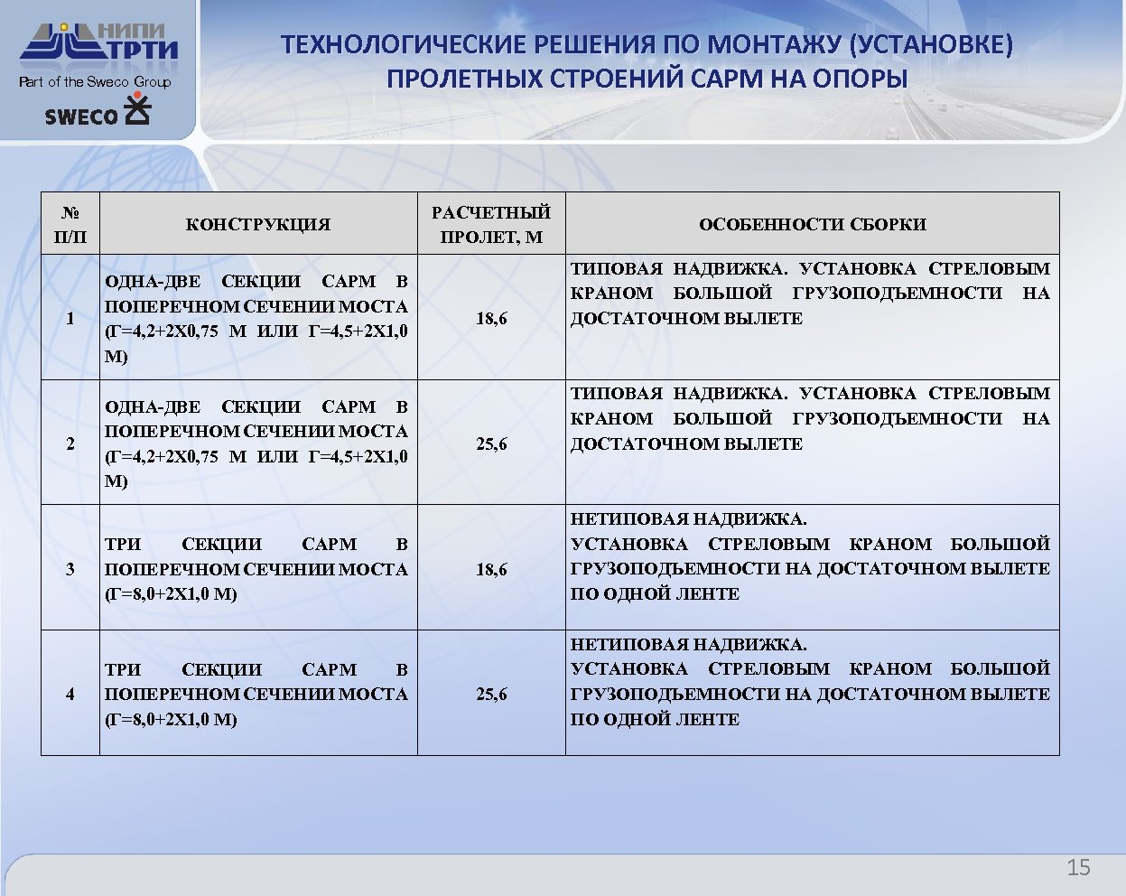 Part of the Sweco Group ТЕХНОЛОГИЧЕСКИЕ РЕШЕНИЯ ПО МОНТАЖУ (УСТАНОВКЕ) ПРОЛЕТНЫХ СТРОЕНИЙ САРМ НА ОПОРЫ № П/П КОНСТРУКЦИЯ 1 ОДНА-ДВЕ СЕКЦИИ САРМ В ПОПЕРЕЧНОМ СЕЧЕНИИ МОСТА (Г=4, 2+2 Х 0, 75 М ИЛИ Г=4, 5+2 Х 1, 0 М) 2 3 4 ОДНА-ДВЕ СЕКЦИИ САРМ В ПОПЕРЕЧНОМ СЕЧЕНИИ МОСТА (Г=4, 2+2 Х 0, 75 М ИЛИ Г=4, 5+2 Х 1, 0 М) ТРИ СЕКЦИИ САРМ В ПОПЕРЕЧНОМ СЕЧЕНИИ МОСТА (Г=8, 0+2 Х 1, 0 М) РАСЧЕТНЫЙ ПРОЛЕТ, М ОСОБЕННОСТИ СБОРКИ 18, 6 ТИПОВАЯ НАДВИЖКА. УСТАНОВКА СТРЕЛОВЫМ КРАНОМ БОЛЬШОЙ ГРУЗОПОДЪЕМНОСТИ НА ДОСТАТОЧНОМ ВЫЛЕТЕ 25, 6 ТИПОВАЯ НАДВИЖКА. УСТАНОВКА СТРЕЛОВЫМ КРАНОМ БОЛЬШОЙ ГРУЗОПОДЪЕМНОСТИ НА ДОСТАТОЧНОМ ВЫЛЕТЕ 18, 6 25, 6 НЕТИПОВАЯ НАДВИЖКА. УСТАНОВКА СТРЕЛОВЫМ КРАНОМ БОЛЬШОЙ ГРУЗОПОДЪЕМНОСТИ НА ДОСТАТОЧНОМ ВЫЛЕТЕ ПО ОДНОЙ ЛЕНТЕ 15