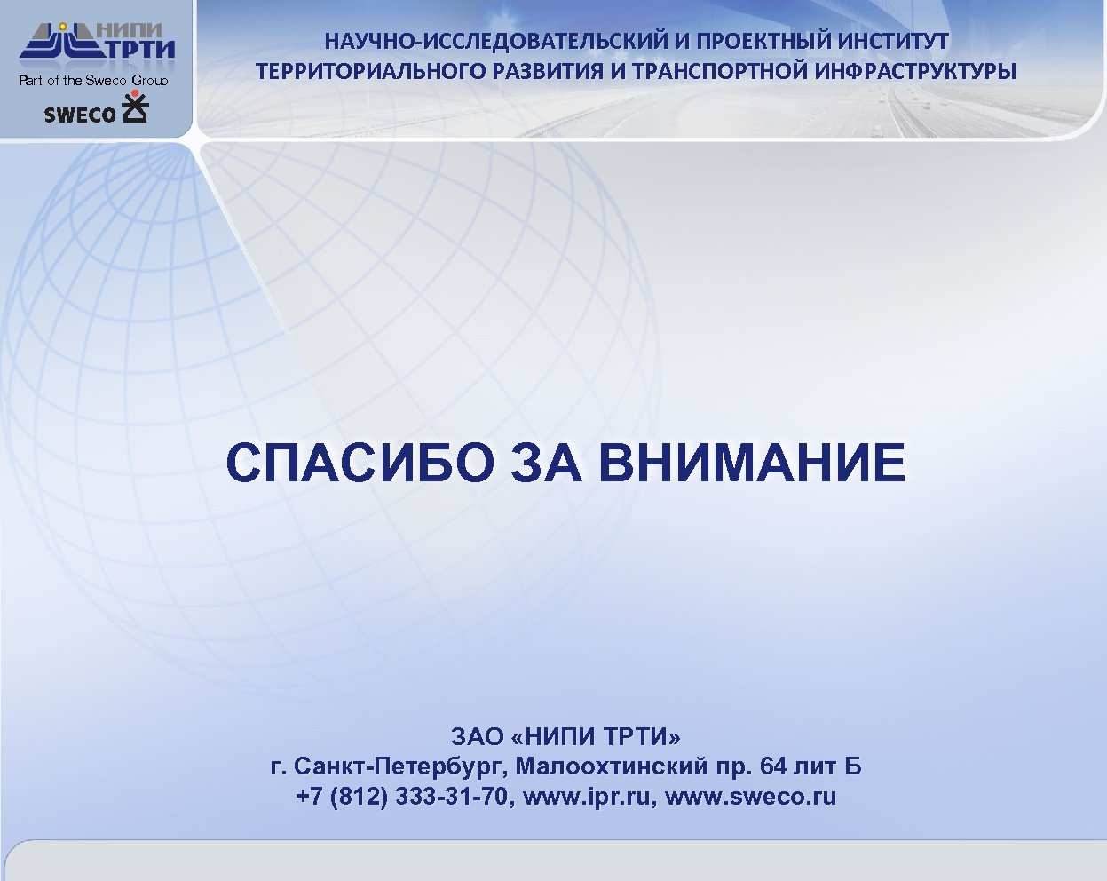 Part of the Sweco Group НАУЧНО-ИССЛЕДОВАТЕЛЬСКИЙ И ПРОЕКТНЫЙ ИНСТИТУТ ТЕРРИТОРИАЛЬНОГО РАЗВИТИЯ И ТРАНСПОРТНОЙ ИНФРАСТРУКТУРЫ СПАСИБО ЗА ВНИМАНИЕ ЗАО «НИПИ ТРТИ» г. Санкт-Петербург, Малоохтинский пр. 64 лит Б +7 (812) 333 -31 -70, www. ipr. ru, www. sweco. ru