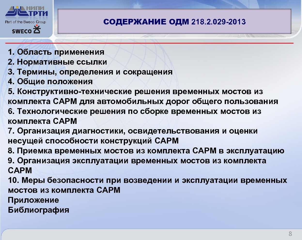 Part of the Sweco Group СОДЕРЖАНИЕ ОДМ 218. 2. 029 -2013 1. Область применения 2. Нормативные ссылки 3. Термины, определения и сокращения 4. Общие положения 5. Конструктивно-технические решения временных мостов из комплекта САРМ для автомобильных дорог общего пользования 6. Технологические решения по сборке временных мостов из комплекта САРМ 7. Организация диагностики, освидетельствования и оценки несущей способности конструкций САРМ 8. Приемка временных мостов из комплекта САРМ в эксплуатацию 9. Организация эксплуатации временных мостов из комплекта САРМ 10. Меры безопасности при возведении и эксплуатации временных мостов из комплекта САРМ Приложение Библиография 8