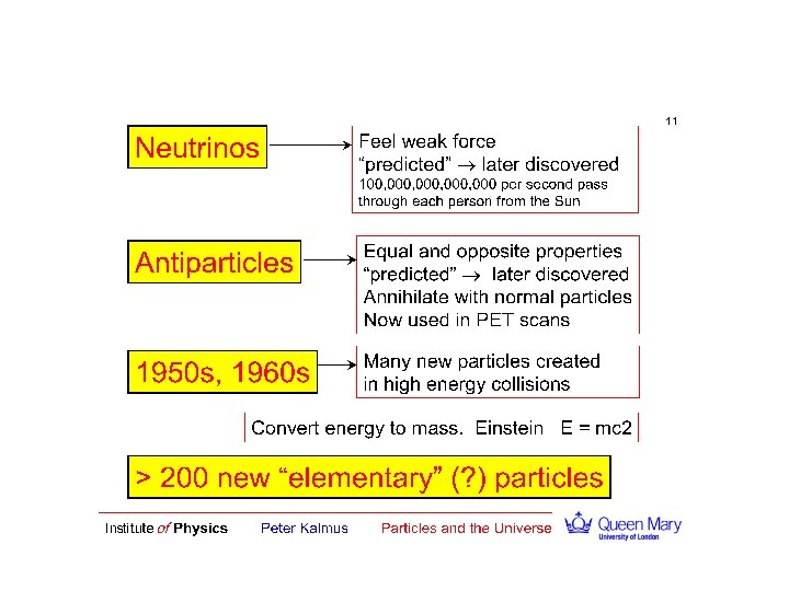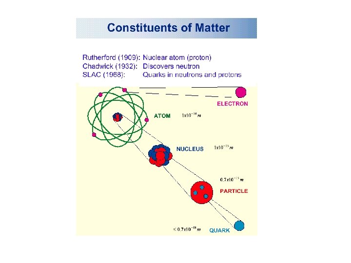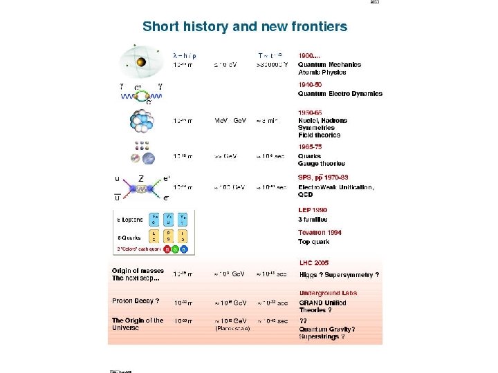Ancient times People think that earth, air, fire, and water are the fundamental elements. 1802 Dalton’s Atomic theory began forming. 1897 J. J. Thompson discovered the electron. 1911 Rutherford discovered positive nucleus. 1930 Pauli invented the neutrino particle. 1932 James Chadwick discovered the neutron. 1937 The muon was discovered by J. C. Street and E. C. Stevenson. 1956 First discovery of the neutrino by an experiment: the electron neutrino. 1962 Discovery of an other type of neutrino: the muon neutrino. 1969 Friedman, Kendall, and Taylor found the first evidence of quarks. 1974 The charmed quark was observed. 1976 The tau lepton was discovered at SPEAR. 1977 Experimenters found proof of the bottom quark. 1983 Carlo Rubbia and Simon Van der Meer discovered the W and Z bosons. 1991 LEP experiments show that there are only three light neutrinos. 1995 The top quark was found at Fermilab. 1998 Neutrino oscillations may have been seen in LSND and Super-Kamiokande. 2000 The tau neutrino was observed at Fermilab. 2003 A Five-Quark State has been discovered.