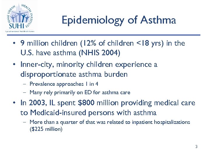 Outline • Background – Epidemiology of Asthma – Asthma in Chicago • Pediatric Asthma Initiative – 2 (PAI-2) • Lessons Learned / Challenges • Recommendations 2