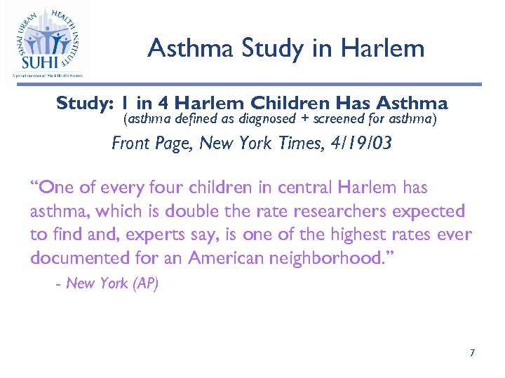 Asthma Study in Harlem Study: 1 in 4 Harlem Children Has Asthma (asthma defined as diagnosed + screened for asthma) Front Page, New York Times, 4/19/03 “One of every four children in central Harlem has asthma, which is double the rate researchers expected to find and, experts say, is one of the highest rates ever documented for an American neighborhood. ” - New York (AP) 7