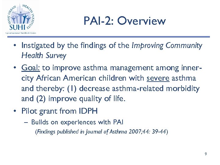 PAI-2: Overview • Instigated by the findings of the Improving Community Health Survey • Goal: to improve asthma management among innercity African American children with severe asthma and thereby: (1) decrease asthma-related morbidity and (2) improve quality of life. • Pilot grant from IDPH – Builds on experiences with PAI (Findings published in Journal of Asthma 2007; 44: 39 -44) 9