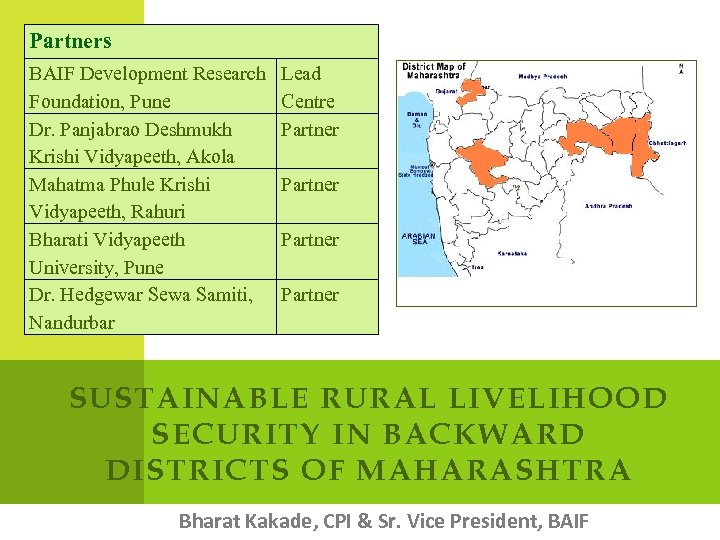 Partners BAIF Development Research Foundation, Pune Dr. Panjabrao Deshmukh Krishi Vidyapeeth, Akola Mahatma Phule Krishi Vidyapeeth, Rahuri Bharati Vidyapeeth University, Pune Dr. Hedgewar Sewa Samiti, Nandurbar Lead Centre Partner SUSTAINABLE RURAL LIVELIHOOD SECURITY IN BACKWARD DISTRICTS OF MAHARASHTRA Bharat Kakade, CPI & Sr. Vice President, BAIF