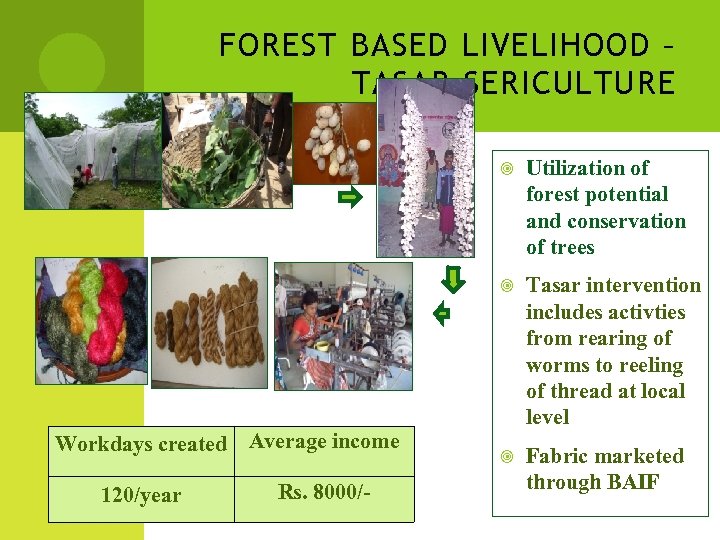 FOREST BASED LIVELIHOOD – TASAR SERICULTURE Workdays created Average income 120/year Rs. 8000/- Utilization of forest potential and conservation of trees Tasar intervention includes activties from rearing of worms to reeling of thread at local level Fabric marketed through BAIF