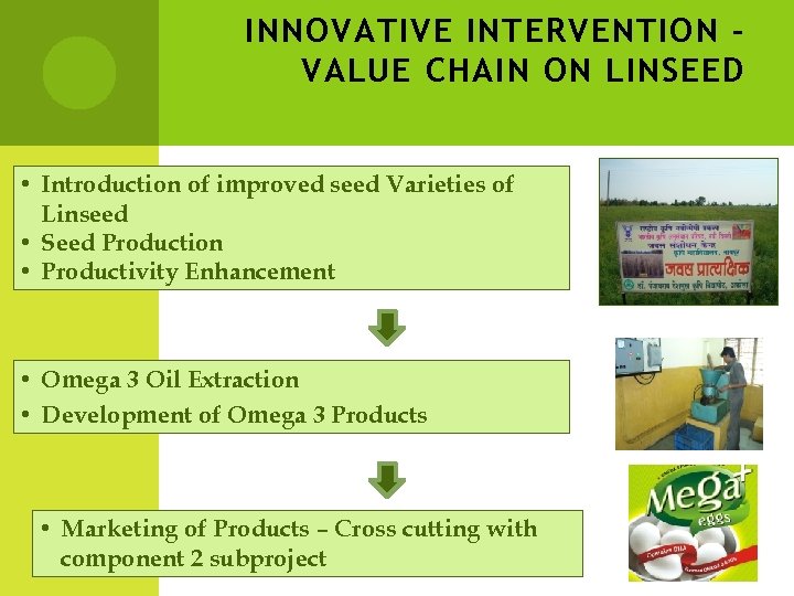 INNOVATIVE INTERVENTION – VALUE CHAIN ON LINSEED • Introduction of improved seed Varieties of Linseed • Seed Production • Productivity Enhancement • Omega 3 Oil Extraction • Development of Omega 3 Products • Marketing of Products – Cross cutting with component 2 subproject