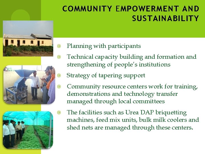 COMMUNITY EMPOWERMENT AND SUSTAINABILITY Planning with participants Technical capacity building and formation and strengthening of people’s institutions Strategy of tapering support Community resource centers work for training, demonstrations and technology transfer managed through local committees The facilities such as Urea DAP briquetting machines, feed mix units, bulk milk coolers and shed nets are managed through these centers.