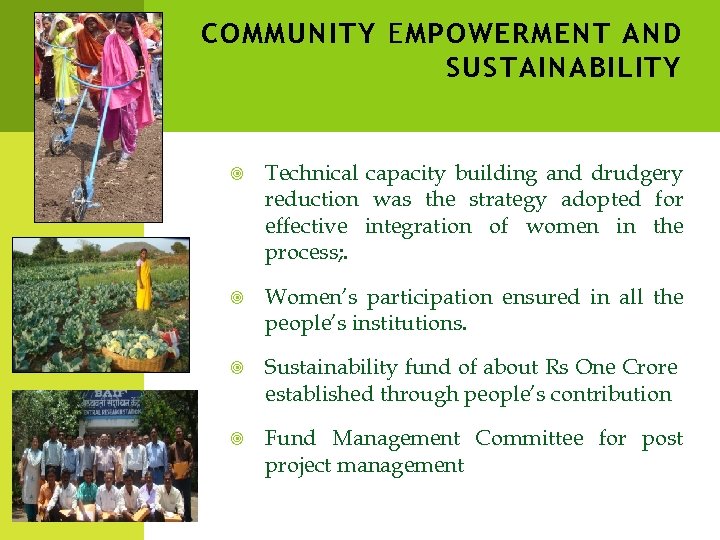 COMMUNITY EMPOWERMENT AND SUSTAINABILITY Technical capacity building and drudgery reduction was the strategy adopted for effective integration of women in the process; . Women’s participation ensured in all the people’s institutions. Sustainability fund of about Rs One Crore established through people’s contribution Fund Management Committee for post project management