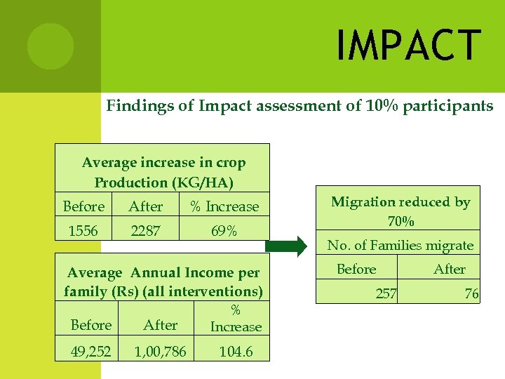 IMPACT Findings of Impact assessment of 10% participants Average increase in crop Production (KG/HA) Before After % Increase 1556 2287 69% Average Annual Income per family (Rs) (all interventions) % Before After Increase 49, 252 1, 00, 786 104. 6 Migration reduced by 70% No. of Families migrate Before 257 After 76