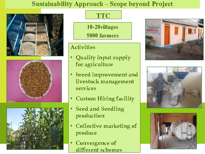 Sustainability Approach – Scope beyond Project TTC 10 -20 villages 5000 farmers Activities • Quality input supply for agriculture • breed improvement and livestock management services • Custom Hiring facility • Seed and Seedling production • Collective marketing of produce • Convergence of different schemes