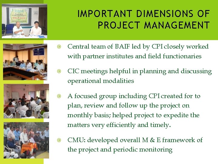 IMPORTANT DIMENSIONS OF PROJECT MANAGEMENT Central team of BAIF led by CPI closely worked with partner institutes and field functionaries CIC meetings helpful in planning and discussing operational modalities A focused group including CPI created for to plan, review and follow up the project on monthly basis; helped project to expedite the matters very efficiently and timely. CMU: developed overall M & E framework of the project and periodic monitoring