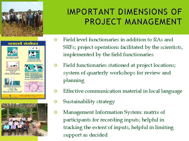 IMPORTANT DIMENSIONS OF PROJECT MANAGEMENT Field level functionaries in addition to RAs and SRFs; project operations facilitated by the scientists, implemented by the field functionaries Field functionaries stationed at project locations; system of quarterly workshops for review and planning Effective communication material in local language Sustainability strategy Management Information System: matrix of participants for recording inputs; helpful in tracking the extent of inputs, helpful in limiting support as decided