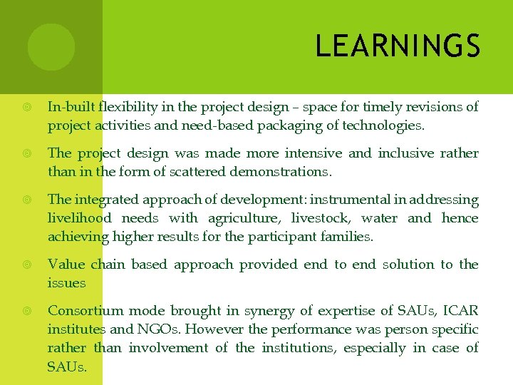 LEARNINGS In-built flexibility in the project design – space for timely revisions of project activities and need-based packaging of technologies. The project design was made more intensive and inclusive rather than in the form of scattered demonstrations. The integrated approach of development: instrumental in addressing livelihood needs with agriculture, livestock, water and hence achieving higher results for the participant families. Value chain based approach provided end to end solution to the issues Consortium mode brought in synergy of expertise of SAUs, ICAR institutes and NGOs. However the performance was person specific rather than involvement of the institutions, especially in case of SAUs.