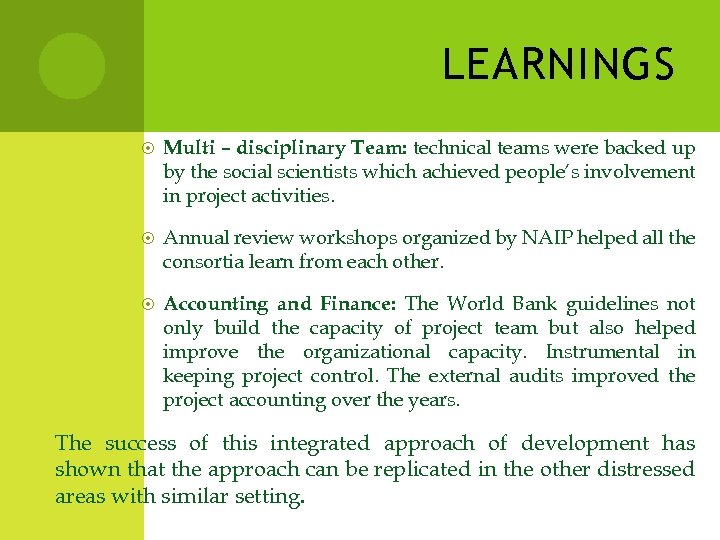 LEARNINGS Multi – disciplinary Team: technical teams were backed up by the social scientists which achieved people’s involvement in project activities. Annual review workshops organized by NAIP helped all the consortia learn from each other. Accounting and Finance: The World Bank guidelines not only build the capacity of project team but also helped improve the organizational capacity. Instrumental in keeping project control. The external audits improved the project accounting over the years. The success of this integrated approach of development has shown that the approach can be replicated in the other distressed areas with similar setting.