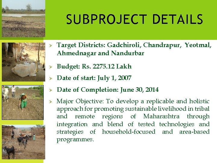 SUBPROJECT DETAILS Ø Target Districts: Gadchiroli, Chandrapur, Yeotmal, Ahmednagar and Nandurbar Ø Budget: Rs. 2275. 12 Lakh Ø Date of start: July 1, 2007 Ø Date of Completion: June 30, 2014 Ø Major Objective: To develop a replicable and holistic approach for promoting sustainable livelihood in tribal and remote regions of Maharashtra through integration and blend of tested technologies and strategies of household-focused and area-based programmes.
