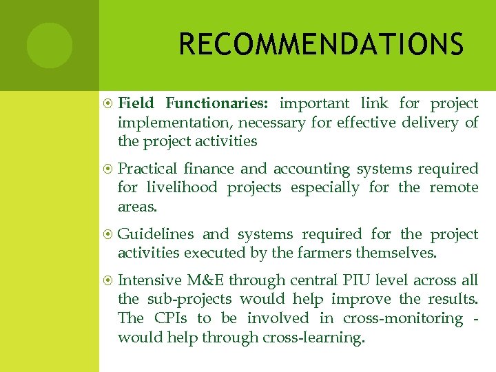 RECOMMENDATIONS Functionaries: important link for project implementation, necessary for effective delivery of the project activities Field Practical finance and accounting systems required for livelihood projects especially for the remote areas. Guidelines and systems required for the project activities executed by the farmers themselves. Intensive M&E through central PIU level across all the sub-projects would help improve the results. The CPIs to be involved in cross-monitoring would help through cross-learning.
