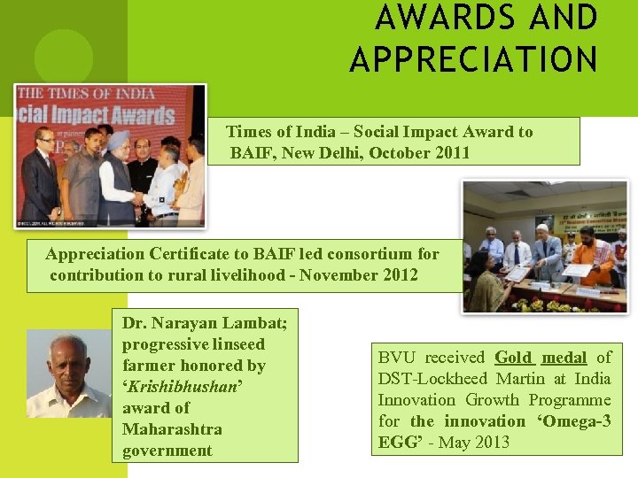 AWARDS AND APPRECIATION Times of India – Social Impact Award to BAIF, New Delhi, October 2011 Appreciation Certificate to BAIF led consortium for contribution to rural livelihood - November 2012 Dr. Narayan Lambat; progressive linseed farmer honored by ‘Krishibhushan’ award of Maharashtra government BVU received Gold medal of DST-Lockheed Martin at India Innovation Growth Programme for the innovation ‘Omega-3 EGG’ - May 2013