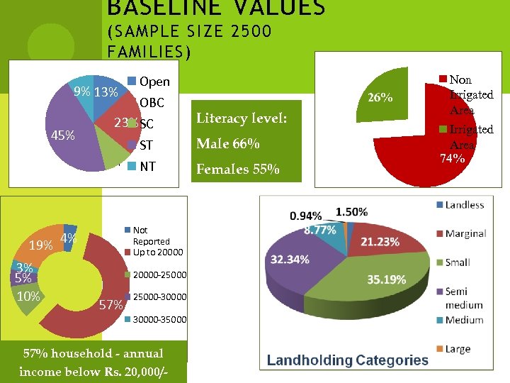 BASELINE VALUES (SAMPLE SIZE 2500 FAMILIES) Open 9% 13% OBC 23% SC 45% ST NT 10% Not Reported Up to 20000 19% 4% 3% 5% 10% 20000 -25000 57% 25000 -30000 -35000 57% household - annual income below Rs. 20, 000/- 26% Literacy level: Male 66% Females 55% Non Irrigated Area 74%