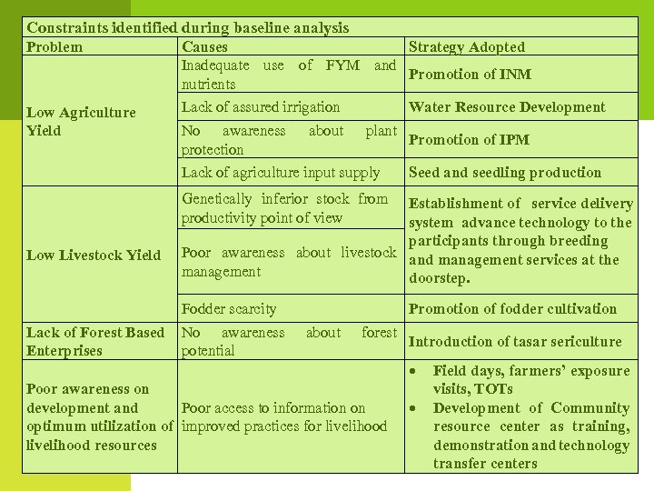 Constraints identified during baseline analysis Problem Causes Strategy Adopted Inadequate use of FYM and Promotion of INM nutrients Low Agriculture Yield Lack of assured irrigation No awareness protection about Water Resource Development plant Lack of agriculture input supply Promotion of IPM Seed and seedling production Genetically inferior stock from productivity point of view Low Livestock Yield Establishment of service delivery system advance technology to the participants through breeding Poor awareness about livestock and management services at the management doorstep. Fodder scarcity Lack of Forest Based No awareness Enterprises potential Promotion of fodder cultivation about forest Introduction of tasar sericulture Poor awareness on development and Poor access to information on optimum utilization of improved practices for livelihood resources Field days, farmers’ exposure visits, TOTs Development of Community resource center as training, demonstration and technology transfer centers