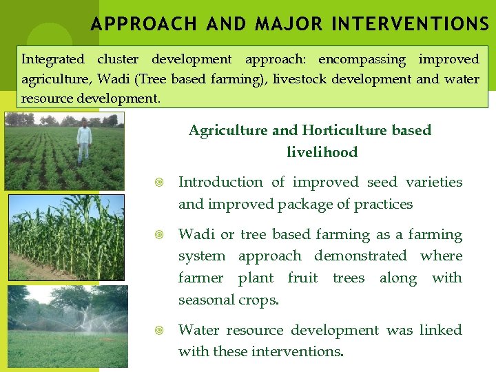 APPROACH AND MAJOR INTERVENTIONS Integrated cluster development approach: encompassing improved agriculture, Wadi (Tree based farming), livestock development and water resource development. Agriculture and Horticulture based livelihood Introduction of improved seed varieties and improved package of practices Wadi or tree based farming as a farming system approach demonstrated where farmer plant fruit trees along with seasonal crops. Water resource development was linked with these interventions.