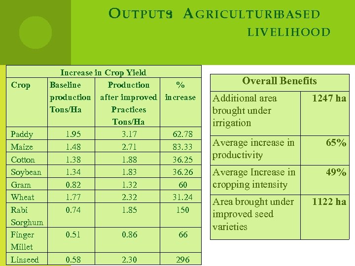 O UTPUTS A GRICULTURE : BASED LIVELIHOOD Increase in Crop Yield Crop Baseline Production % production after improved increase Tons/Ha Practices Tons/Ha Paddy 1. 95 3. 17 62. 78 Maize 1. 48 2. 71 83. 33 Cotton 1. 38 1. 88 36. 25 Soybean 1. 34 1. 83 36. 26 Gram 0. 82 1. 32 60 Wheat 1. 77 2. 32 31. 24 Rabi 0. 74 1. 85 150 Sorghum Finger 0. 51 0. 86 66 Millet Linseed 0. 58 2. 30 296 Overall Benefits Additional area brought under irrigation 1247 ha Average increase in productivity 65% Average Increase in cropping intensity 49% Area brought under improved seed varieties 1122 ha