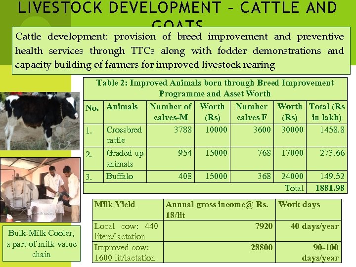 LIVESTOCK DEVELOPMENT – CATTLE AND GOATS Cattle development: provision of breed improvement and preventive health services through TTCs along with fodder demonstrations and capacity building of farmers for improved livestock rearing Table 2: Improved Animals born through Breed Improvement Programme and Asset Worth No. Animals Number of Worth Number Worth Total (Rs calves-M (Rs) calves F (Rs) in lakh) Crossbred 3788 10000 3600 30000 1458. 8 1. cattle Graded up 954 15000 768 17000 273. 66 2. animals Buffalo 408 15000 368 24000 149. 52 3. Total 1881. 98 Milk Yield Bulk-Milk Cooler, a part of milk-value chain Annual gross income@ Rs. Work days 18/lit Local cow: 440 7920 40 days/year liters/lactation Improved cow: 28800 90 -100 1600 lit/lactation days/year