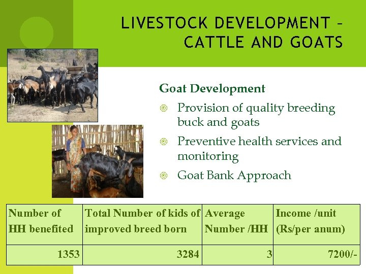 LIVESTOCK DEVELOPMENT – CATTLE AND GOATS Goat Development 1353 Preventive health services and monitoring Number of HH benefited Provision of quality breeding buck and goats Goat Bank Approach Total Number of kids of Average Income /unit improved breed born Number /HH (Rs/per anum) 3284 3 7200/-