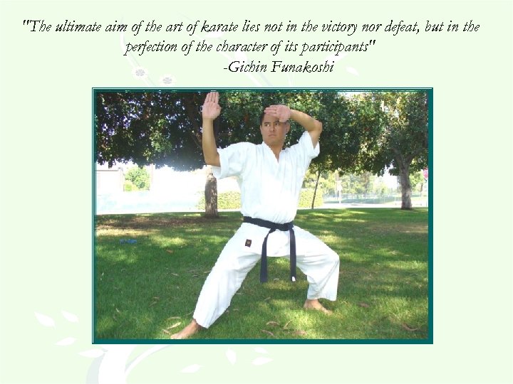 "The ultimate aim of the art of karate lies not in the victory nor defeat, but in the perfection of the character of its participants" -Gichin Funakoshi